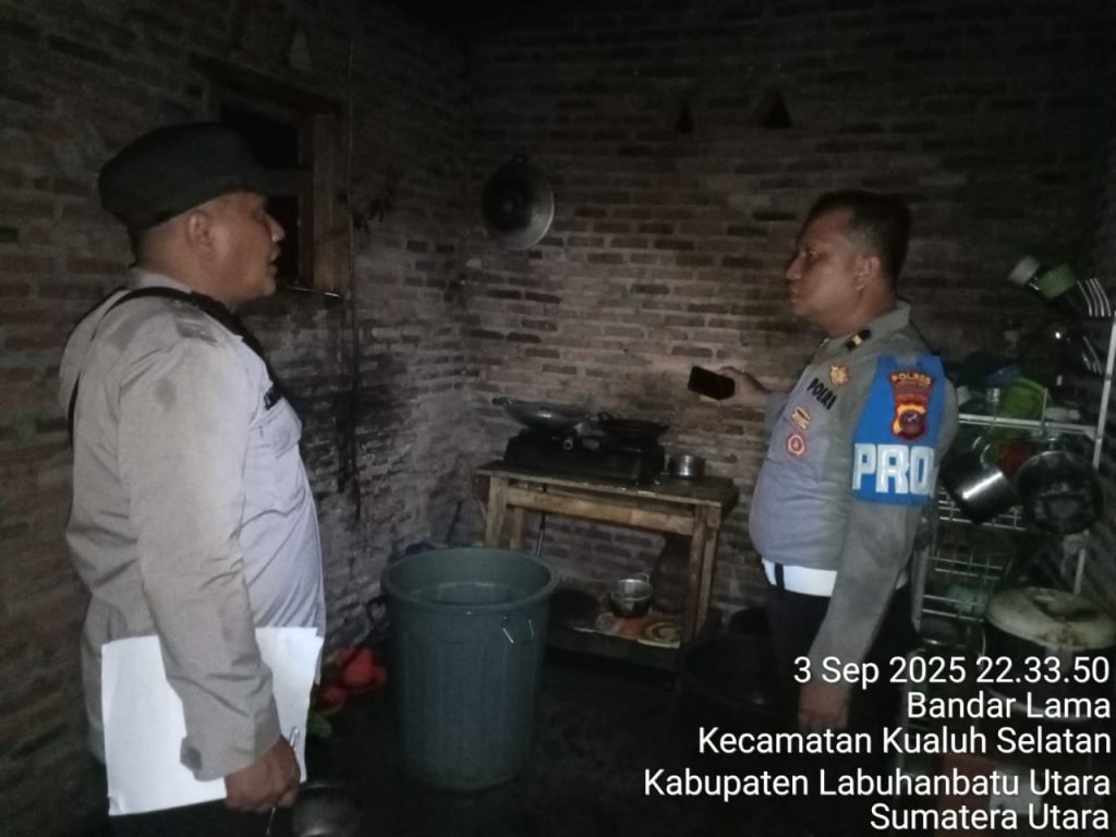 Blusuk.online – Labuhanbatu Utara, 3 September 2025 — Satu unit rumah permanen di Dusun V, Desa Bandar Lama, Kecamatan Kualuh Selatan, hangus terbakar pada Rabu malam (3/9/2025), sekitar pukul 20.00 WIB. Personel Polsek Kualuh Hulu Polres Labuhanbatu langsung turun ke lokasi untuk melakukan pengecekan Tempat Kejadian Perkara (TKP).