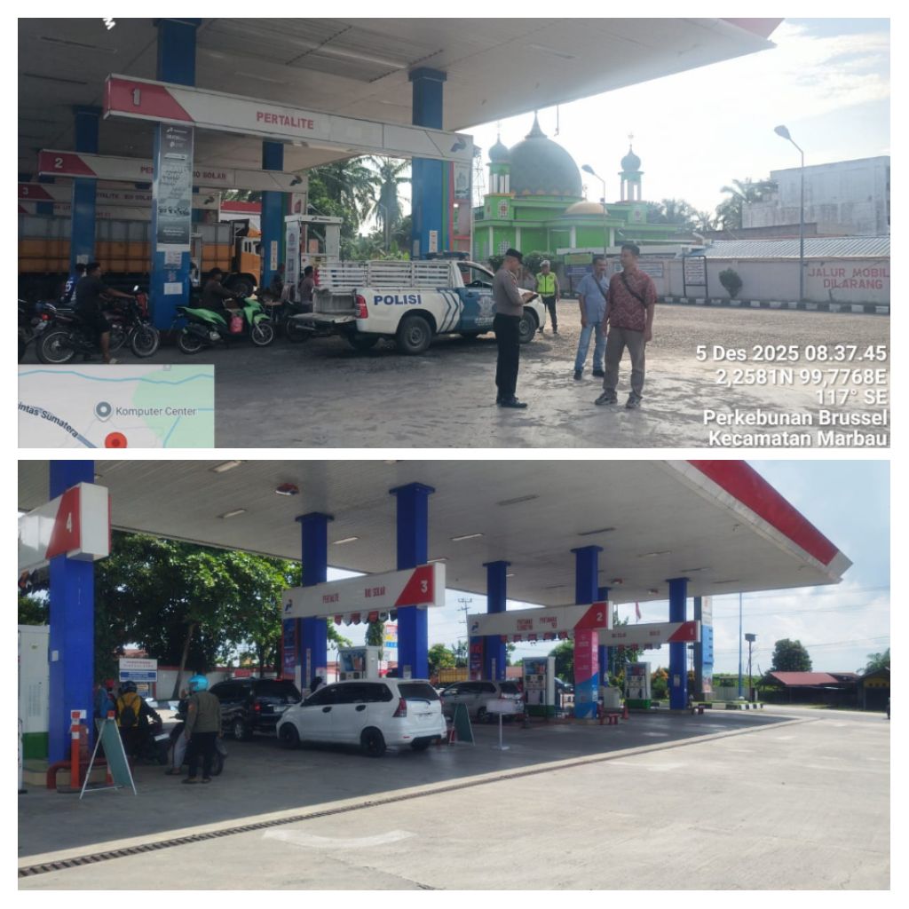 polreslabuhanbatu – Blusuk.online – Polsek Na IX-X melaksanakan patroli serta berkoordinasi dengan pihak SPBU untuk memastikan ketersediaan dan distribusi Bahan Bakar Minyak (BBM) tetap aman dan terkendali, Jumat (05/12/2025). Langkah ini dilakukan sebagai upaya antisipasi penyalahgunaan BBM serta mencegah terjadinya antrian panjang yang berpotensi menimbulkan kemacetan di Jalinsum wilayah hukum Polsek Na IX-X.