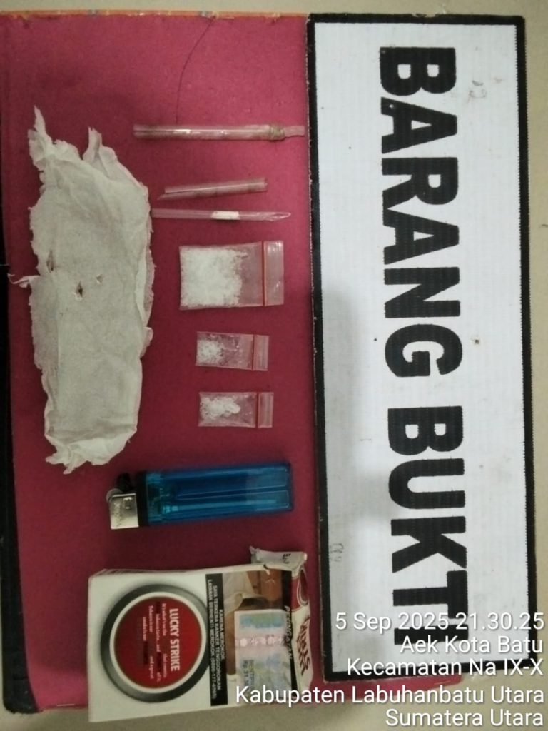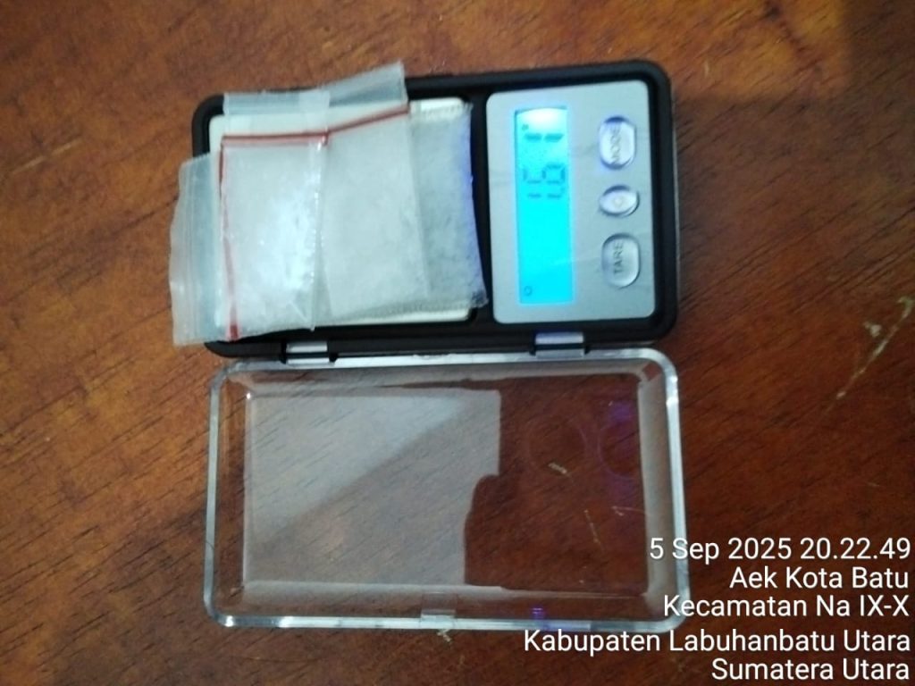 Saat diamankan, pria tersebut diketahui bernama Ali Gunawan Dalimunthe, berusia 34 tahun, warga setempat yang beralamat di Dusun III, Kampung Jawa, Desa Pulo Jantan. Dalam penggeledahan, petugas menemukan barang bukti berupa plastik klip berisi kristal bening diduga sabu, dengan total berat bruto 1,61 gram. Selain itu, ditemukan juga dua buah kaca pirek, satu buah skop yang terbuat dari pipet, satu buah mancis, selembar tisu, dan satu buah kotak rokok.