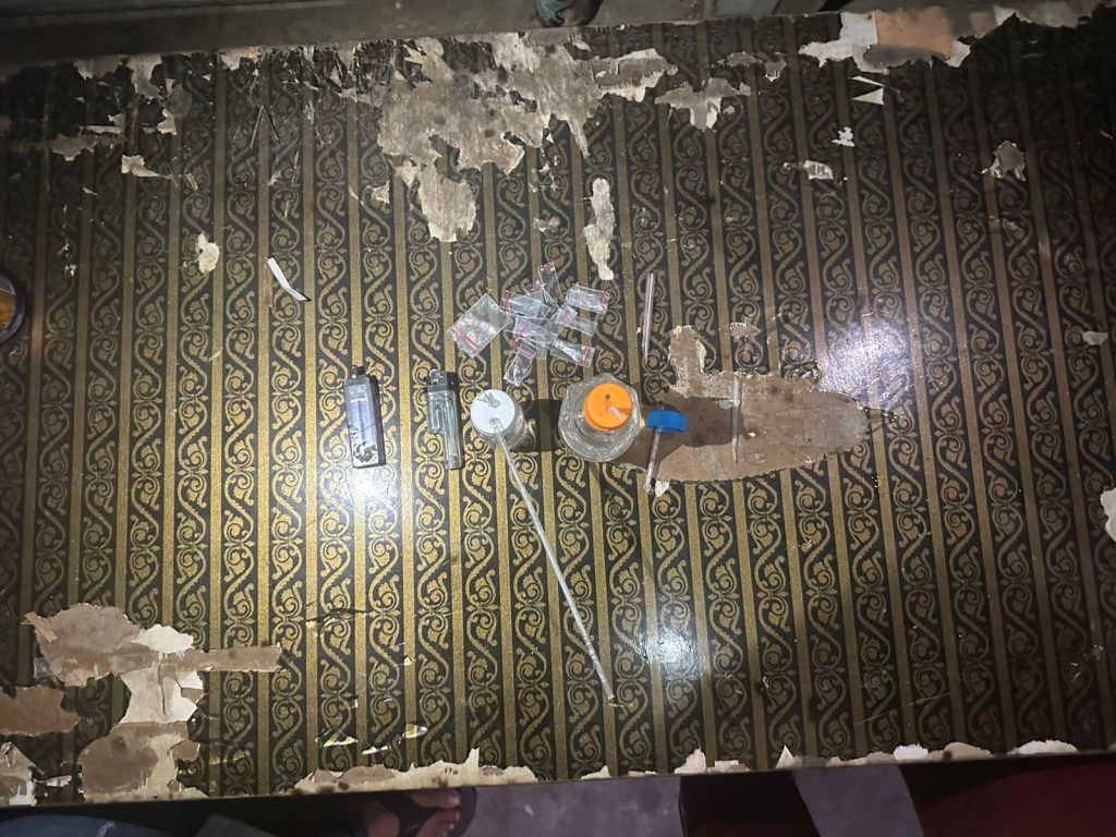 Meski saat penggerebekan tidak ditemukan tersangka maupun aktivitas transaksi narkoba, petugas menemukan sejumlah barang bukti yang menguatkan dugaan bahwa lokasi tersebut kerap digunakan sebagai tempat penyalahgunaan narkotika. Di antaranya adalah plastik klip transparan kosong, dua buah mancis, dua alat hisap sabu (bong), serta dua skop kecil yang terbuat dari pipet plastik.