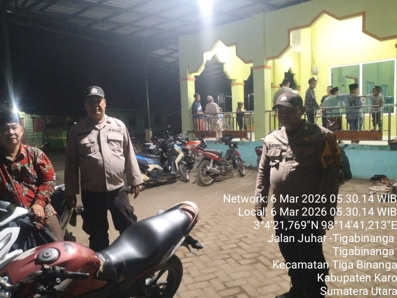 Tigabinanga, Karo – Blusuk.online – Personel Polsek Tigabinanga melaksanakan kegiatan pengamanan ibadah Sholat Subuh berjemaah di wilayah Kecamatan Tigabinanga, Kabupaten Karo, Jumat (6/3/2026) dini hari.