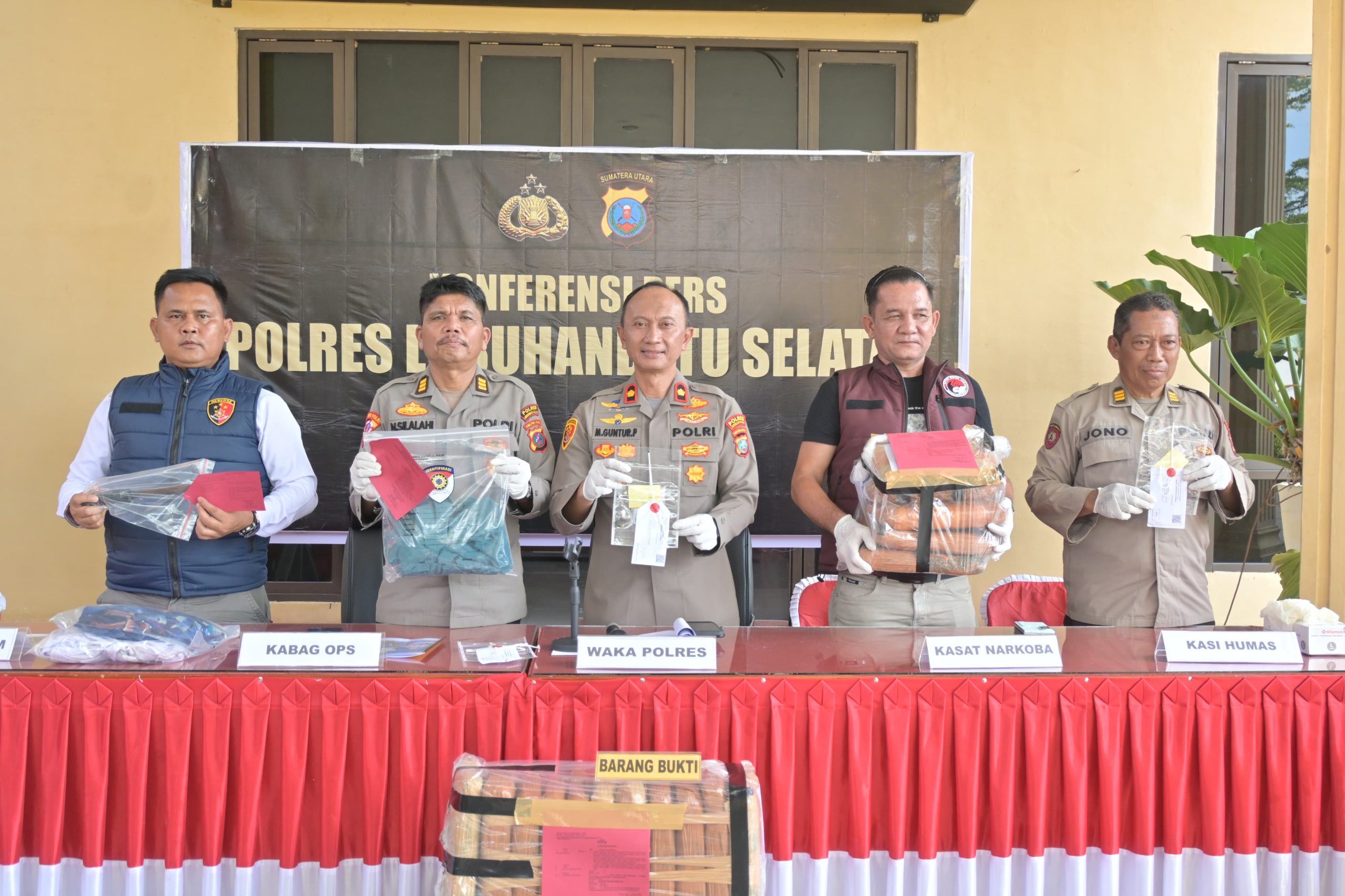 Konferensi pers dihadiri jajaran pejabat utama dan insan pers. Penyampaian hasil kinerja Kapolres Labuhanbatu Selatan AKBP Aditya S.P. Sembiring, S.I.K., diwakili Wakapolres KOMPOL Moch. Guntur Pryantoko, S.H., M.H.
