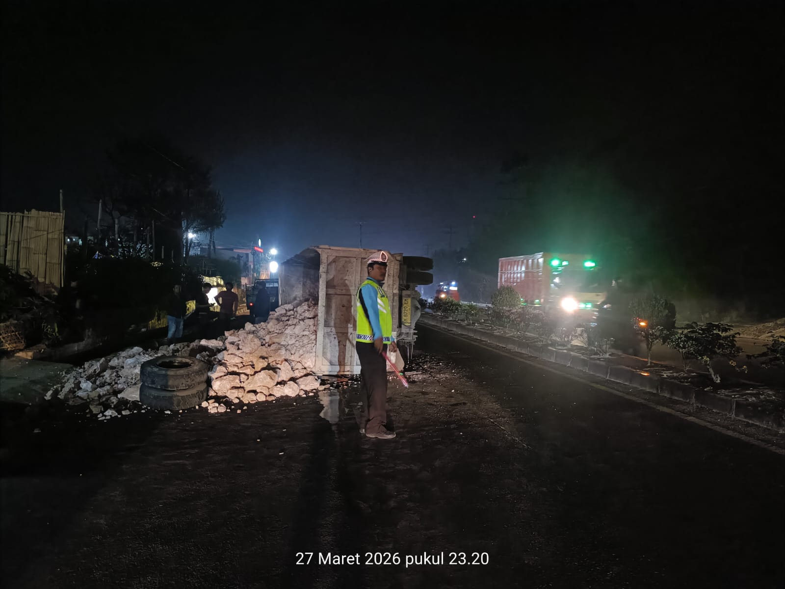 Setibanya di tempat kejadian, personel Samapta langsung berkoordinasi dengan piket Laka Lantas guna penanganan lebih lanjut. Tim Laka Lantas yang turun ke lokasi mendapati truk dalam kondisi terguling ke sisi kiri jalan.