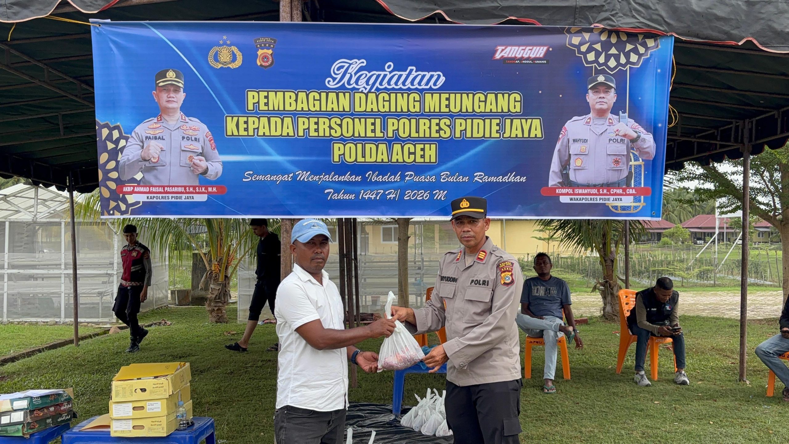 Dalam rangka menyambut bulan suci Ramadhan 1447 Hijriah, Polres Pidie Jaya menggelar kegiatan pemotongan dan penyerahan daging Meugang serta kurma kepada personel, Senin (16/02/2026), di Mapolres Pidie Jaya.