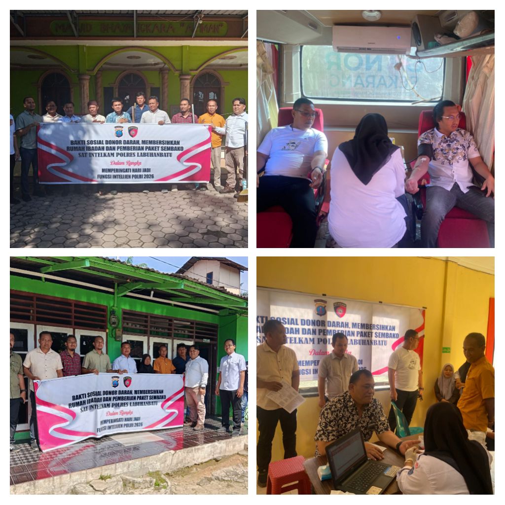 Kegiatan bakti sosial tersebut meliputi donor darah, pembersihan rumah ibadah, serta pemberian paket sembako kepada masyarakat yang membutuhkan. Pelaksanaan kegiatan dipimpin langsung oleh Kasat Intelkam Polres Labuhanbatu, AKP Rubenta Tarigan Sibero, S.H., bersama personel Sat Intelkam Polres Labuhanbatu.