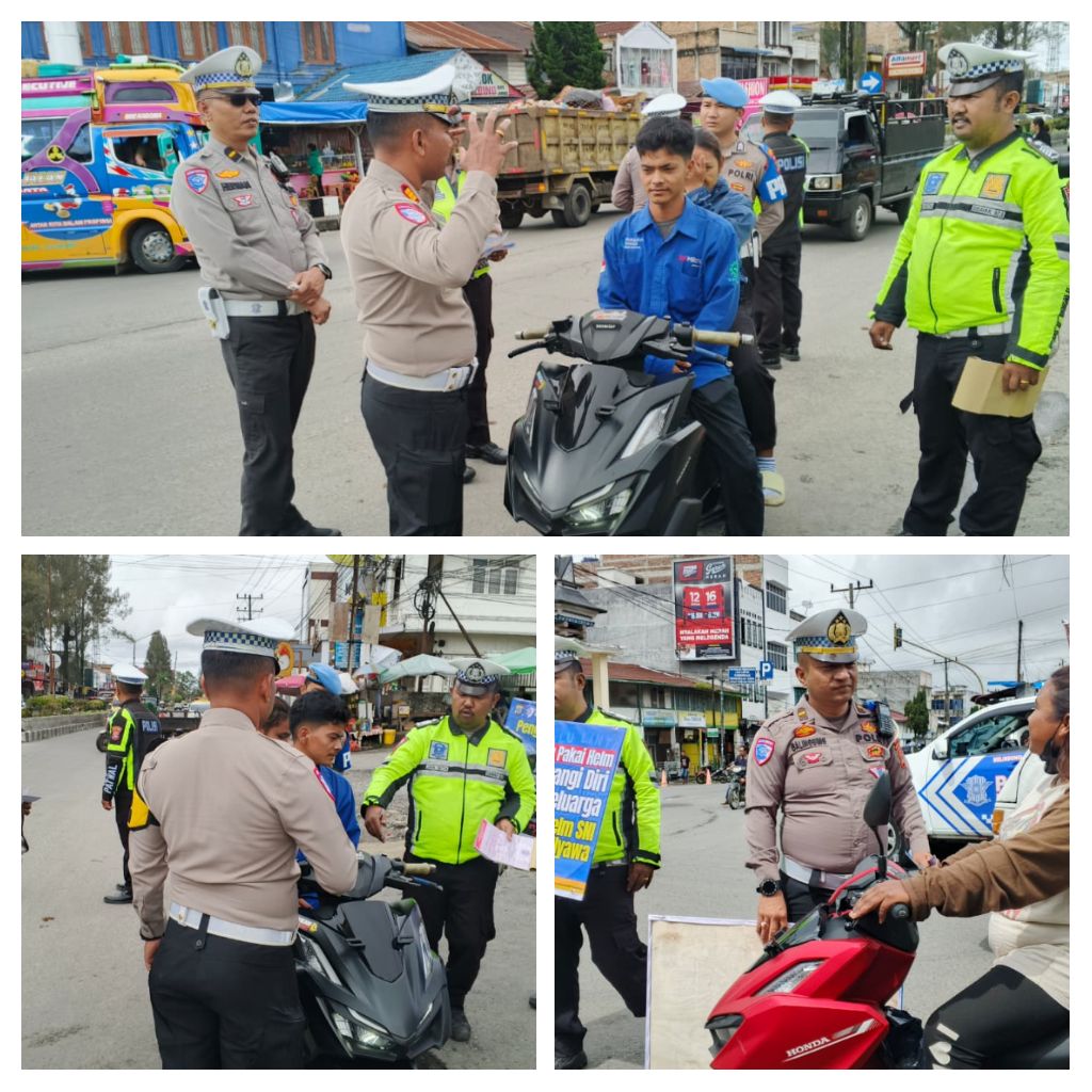 Kegiatan tersebut dipimpin langsung oleh Kasat Lantas Polres Tanah Karo, AKP Andita Sitepu, S.H., M.H., bersama personel Sat Lantas lainnya. Petugas memberikan edukasi sekaligus imbauan kepada pengguna jalan—baik pengendara roda dua maupun roda empat—yang melintasi lokasi kegiatan.
