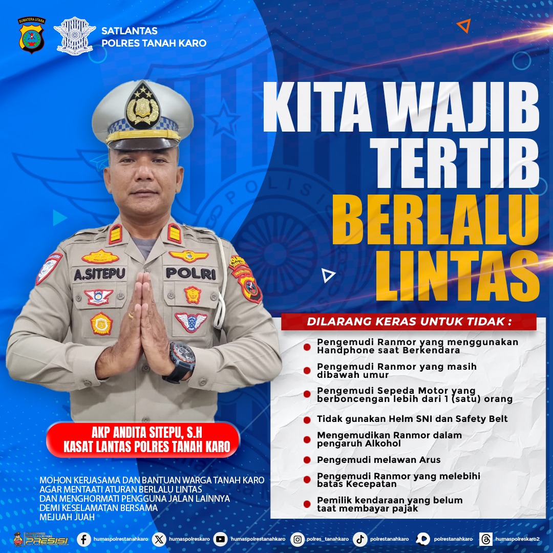 Kasat Lantas Polres Tanah Karo, AKP Andita Sitepu, S.H., mengajak seluruh pengguna jalan untuk selalu mematuhi aturan berlalu lintas demi keselamatan bersama.
