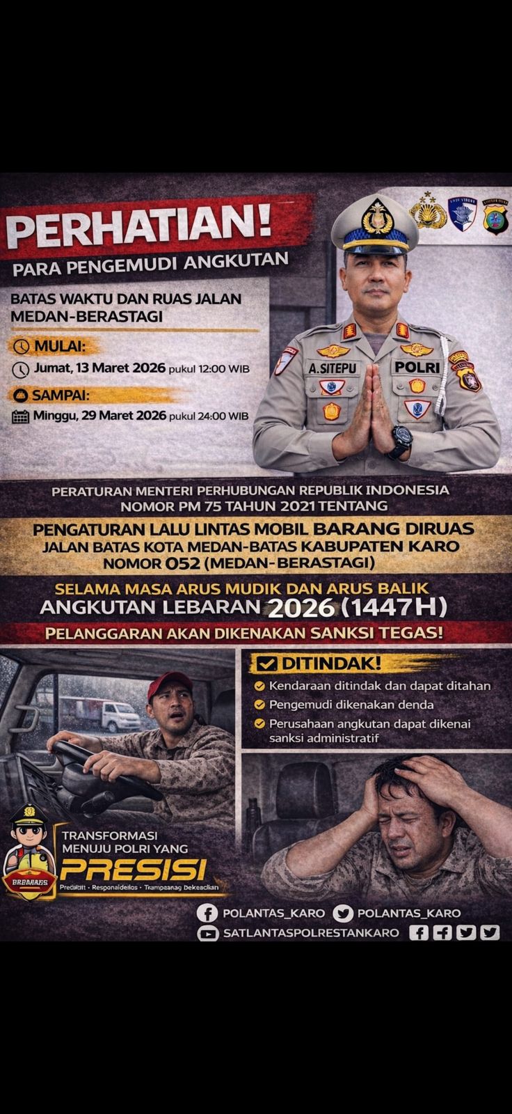 Satlantas Polres Tanah Karo menegaskan bahwa setiap pelanggaran terhadap ketentuan pembatasan operasional akan ditindak sesuai peraturan perundang-undangan yang berlaku. Sanksi yang dapat dikenakan antara lain penahanan kendaraan, tilang terhadap pengemudi, hingga sanksi administratif bagi perusahaan angkutan.