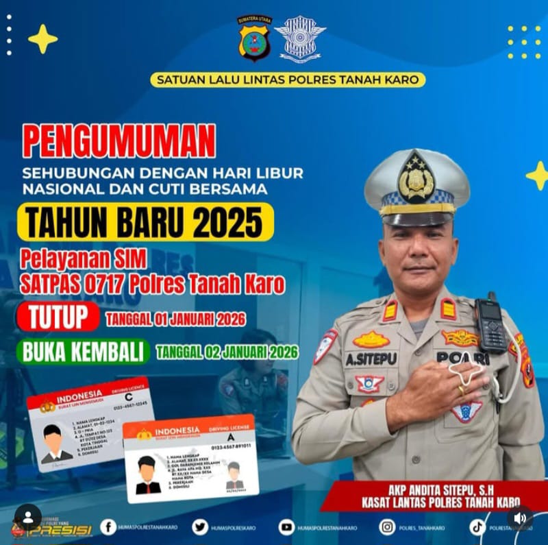 Penutupan pelayanan SIM tersebut berlaku pada Kamis, 1 Januari 2026. Selanjutnya, pelayanan akan dibuka kembali secara normal pada Jumat, 2 Januari 2026 di Satpas 0717 Polres Tanah Karo.