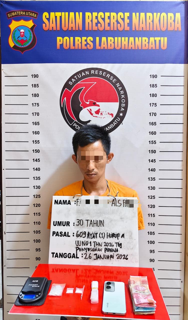 Dalam pengungkapan tersebut, petugas mengamankan seorang laki-laki berinisial FA als F (30), warga Desa Kuala Bangka, Kecamatan Kualuh Hilir, Kabupaten Labuhanbatu Utara. Tersangka diketahui berprofesi sebagai wiraswasta dan diduga terlibat dalam kepemilikan serta peredaran narkotika jenis sabu.