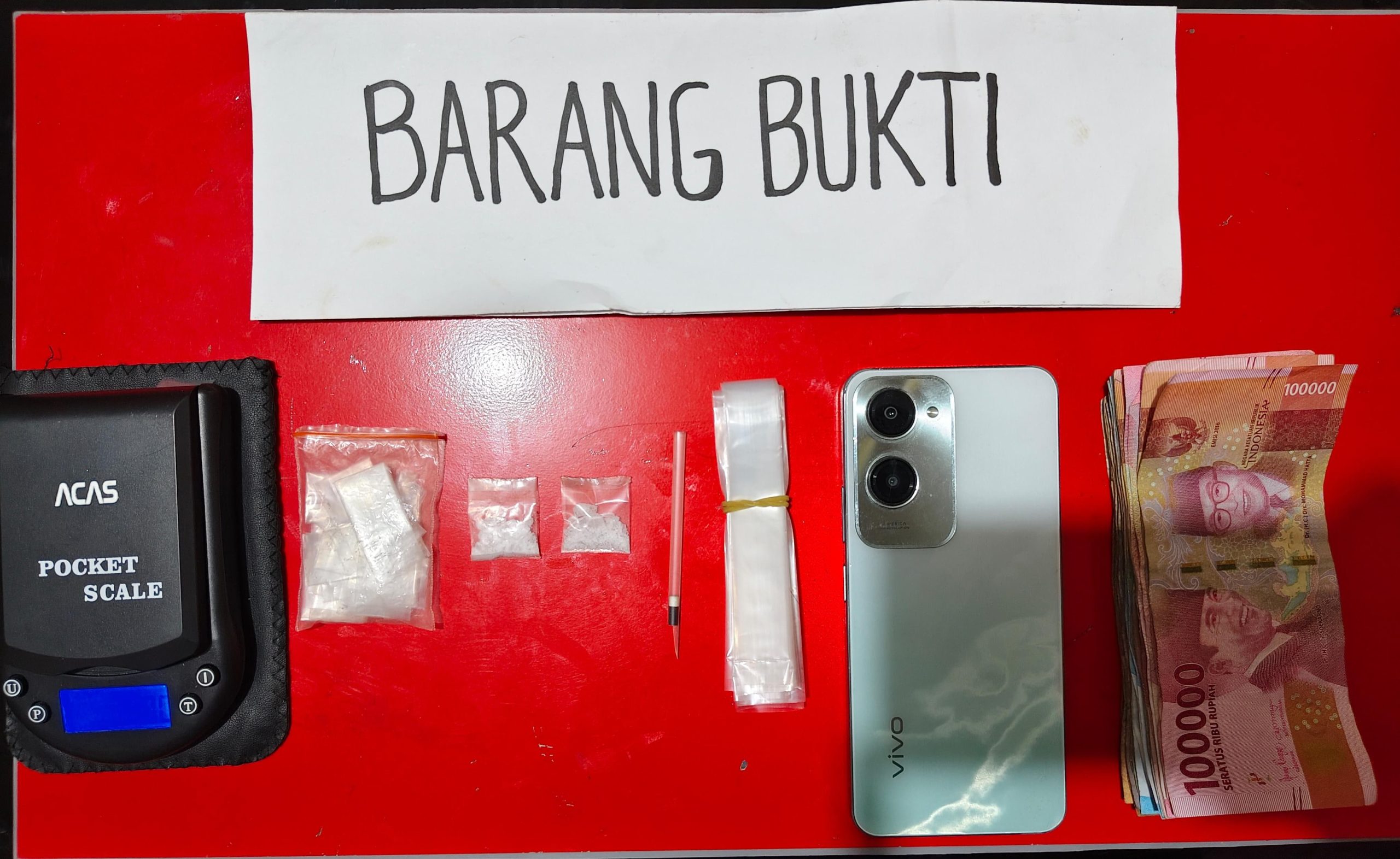 Selain itu, petugas turut mengamankan barang bukti lain berupa 14 bungkus plastik bening berukuran panjang, satu unit telepon genggam Android merek Vivo warna putih, satu buah skop dari pipet, satu plastik klip ukuran sedang berisi plastik kosong, serta uang tunai sebesar Rp1.127.000,-. Total berat bruto narkotika jenis sabu yang diamankan mencapai 1,29 gram.