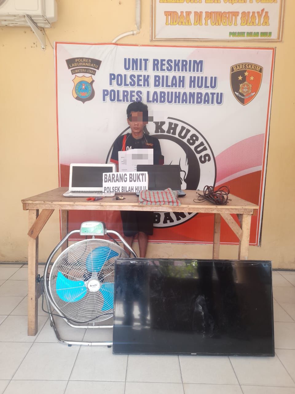 Dalam penangkapan tersebut, polisi turut mengamankan sejumlah barang bukti hasil curian berupa satu unit televisi Samsung 43 inci, dua unit laptop Asus, satu unit kipas angin Arashi, sebuah obeng, gunting potong kabel, dan kain sarung yang digunakan pelaku untuk menutupi wajahnya saat beraksi. Total kerugian ditaksir mencapai Rp18 juta.