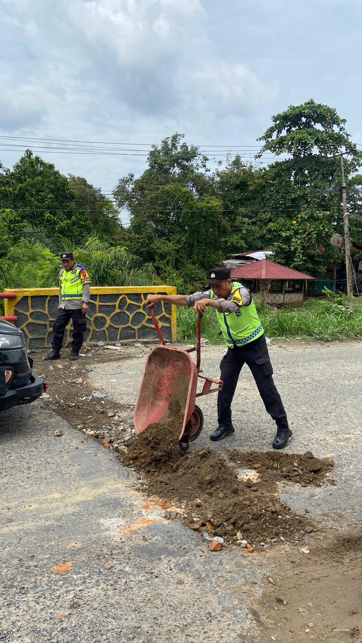 Tak Hanya Jaga Keamanan, Polres Labuhanbatu Selatan Perbaiki Jalan Rusak di Jalinsum Bedagai