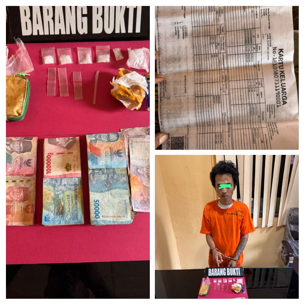 Dari hasil penggeledahan, petugas menemukan satu dompet kecil warna kuning emas berisi enam bungkus plastik klip transparan ukuran sedang berisi diduga sabu dengan berat total bruto 10,45 gram, enam plastik klip kosong ukuran kecil, satu pipet berbentuk sekop, serta uang tunai sebesar Rp3.035.000 yang diduga hasil penjualan narkotika.