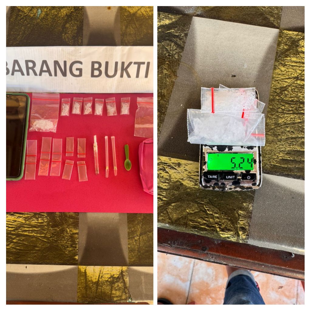 Dari hasil penggeledahan, petugas mengamankan barang bukti berupa satu bungkus plastik klip transparan ukuran besar dan enam bungkus plastik klip kecil transparan masing-masing berisi diduga narkotika jenis sabu dengan total berat bruto 5,24 gram. Selain itu turut diamankan sepuluh plastik klip kecil kosong, satu plastik transparan besar kosong, dua pipet berbentuk sekop, satu kaca pirex, satu sendok plastik kecil, satu dompet kecil warna kuning merah muda, serta satu unit handphone Android.