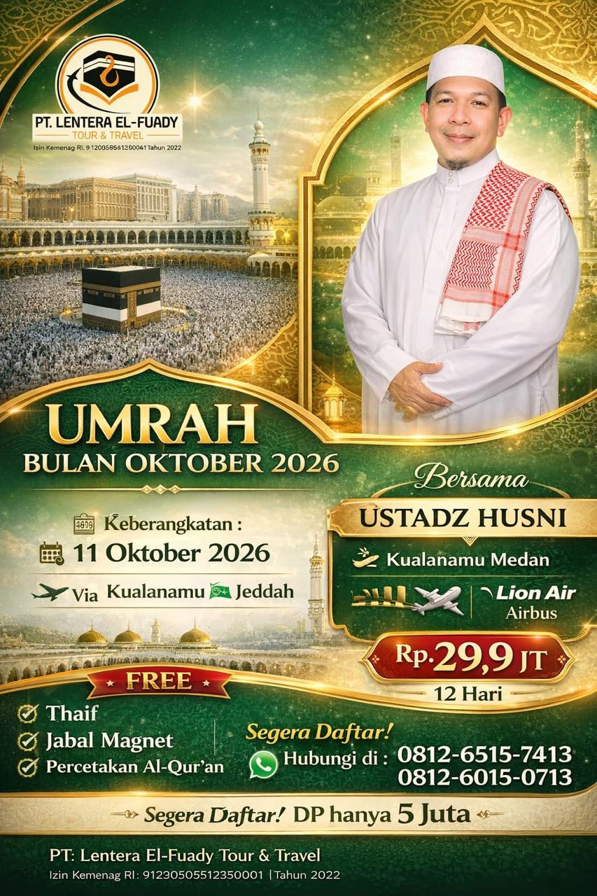 Dalam rangka memberikan kemudahan kepada masyarakat yang ingin menunaikan ibadah umrah, Ustadz Muhammad Fathul Husni, S.HI., M.H., yang dikenal sebagai Ustadz Delisa, mengajak umat Muslim untuk bergabung bersama beliau dalam program ibadah umrah yang direncanakan pada Oktober 2026 mendatang.